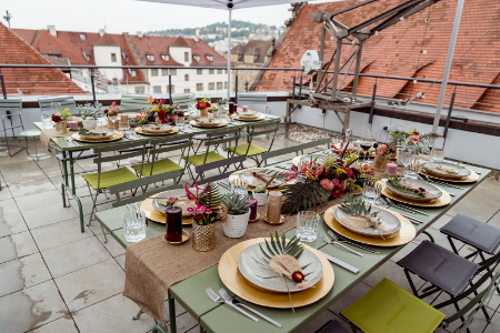 Die 200m² große Dachterrasse mit Wintergarten sorgt für einen faszinierenden Blick über die Innenstatt und Dächer Stuttgarts und bietet Eurer Feier mit einem Outdoor Dinner, einem BBQ oder einfach einer liebevoll ausgestalten Aufenthaltsecke etwas ganz besonderes.